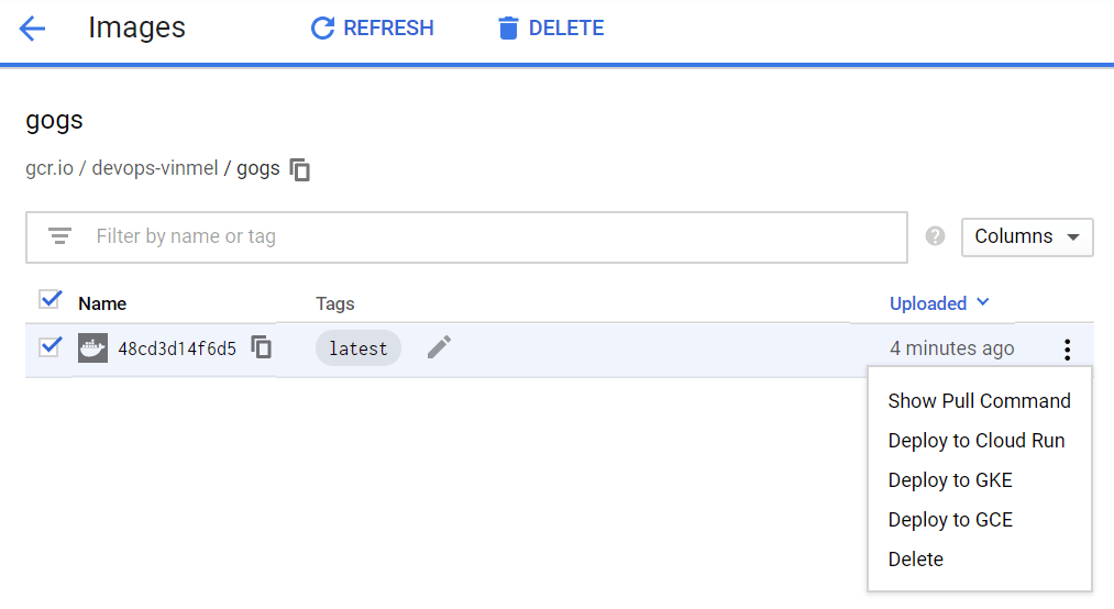 gogs/gogs is our local image which we pulled from docker hub. And, gcr.io/devops-vinmel/gogs:latest is the new image tag where,
