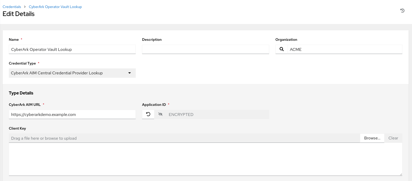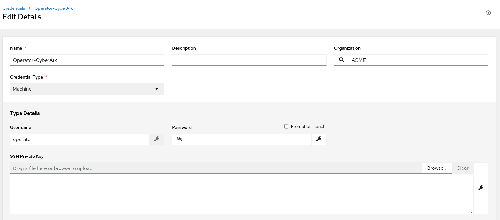 Setting up a machine credential with CyberArk vault lookup is pretty straightforward in the Ansible Automation Platform.