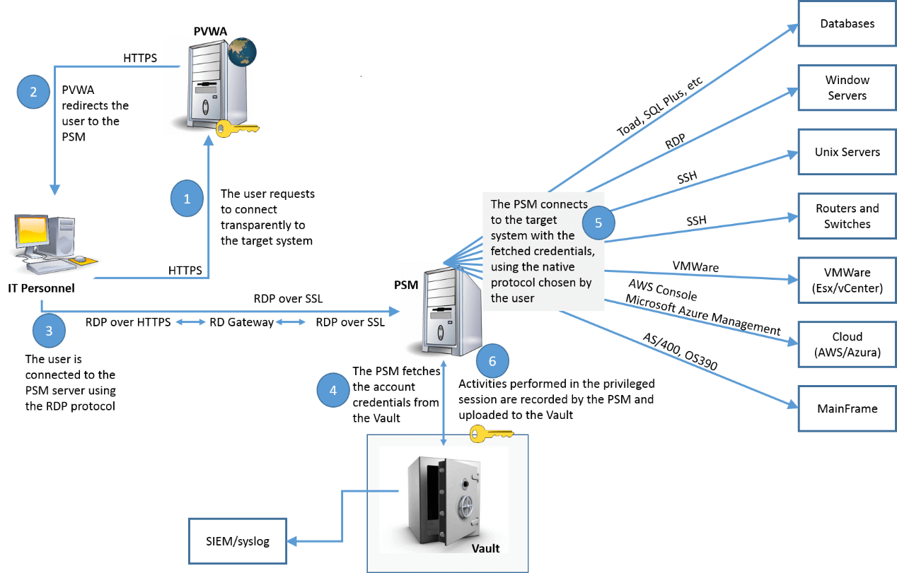 CyberArk’s Privileged Session Manager (PSM) enhances security for organizations by managing, monitoring, and safeguarding privileged access to sensitive systems without exposing actual credentials to users. Acting as a gateway, PSM secures high-risk environments by storing and rotating credentials in a secure vault, enforcing access control, and enabling detailed session monitoring. With support for RDP, SSH, and web protocols, PSM provides compatibility across different systems, centralizing privileged access and logging user actions for compliance and auditing, making it a robust solution for organizations aiming to protect against potential security breaches associated with privileged access.