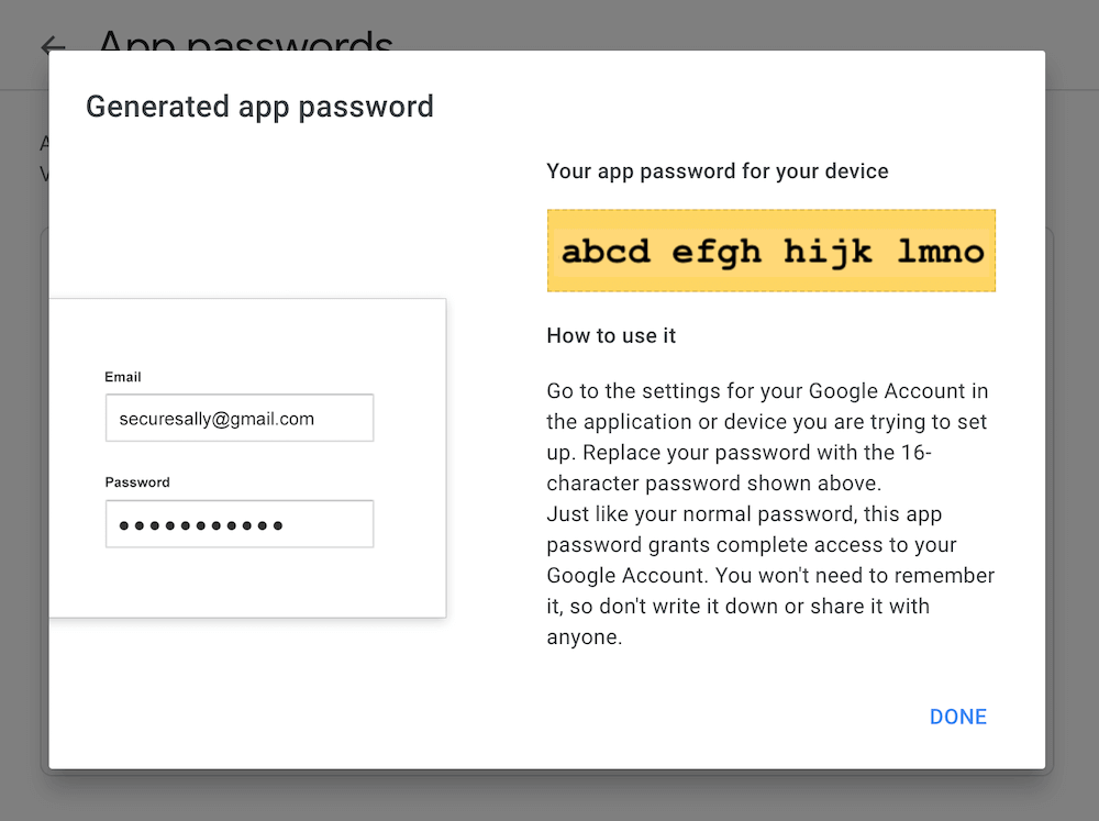 Click on GENERATE button and you will receive the App Password. Remember to copy the password as it wont be visible after this screen.