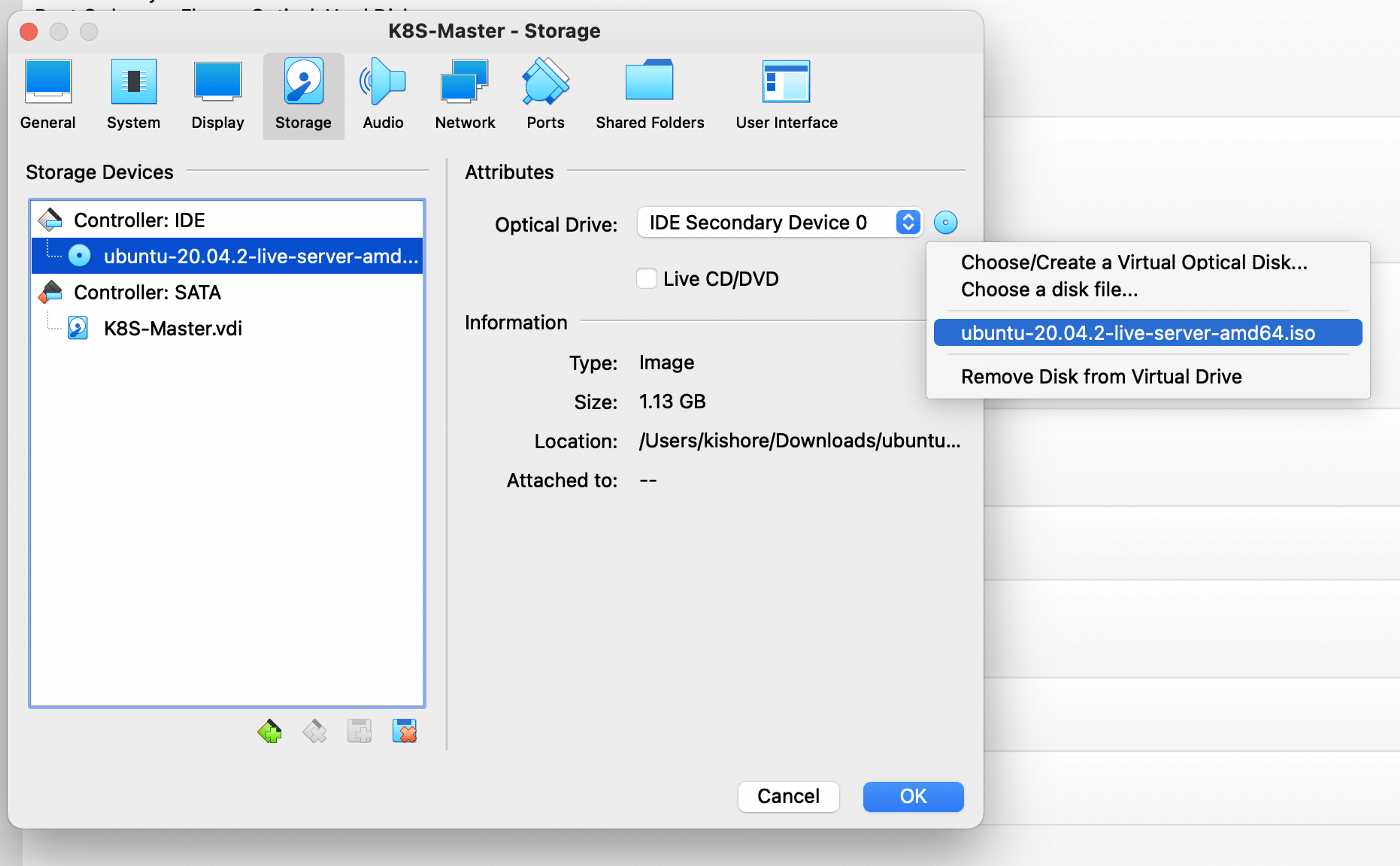 Navigate to storage and ensure that when the VM boots up, it loads the Ubuntu image which we downloaded earlier, so select the ISO image