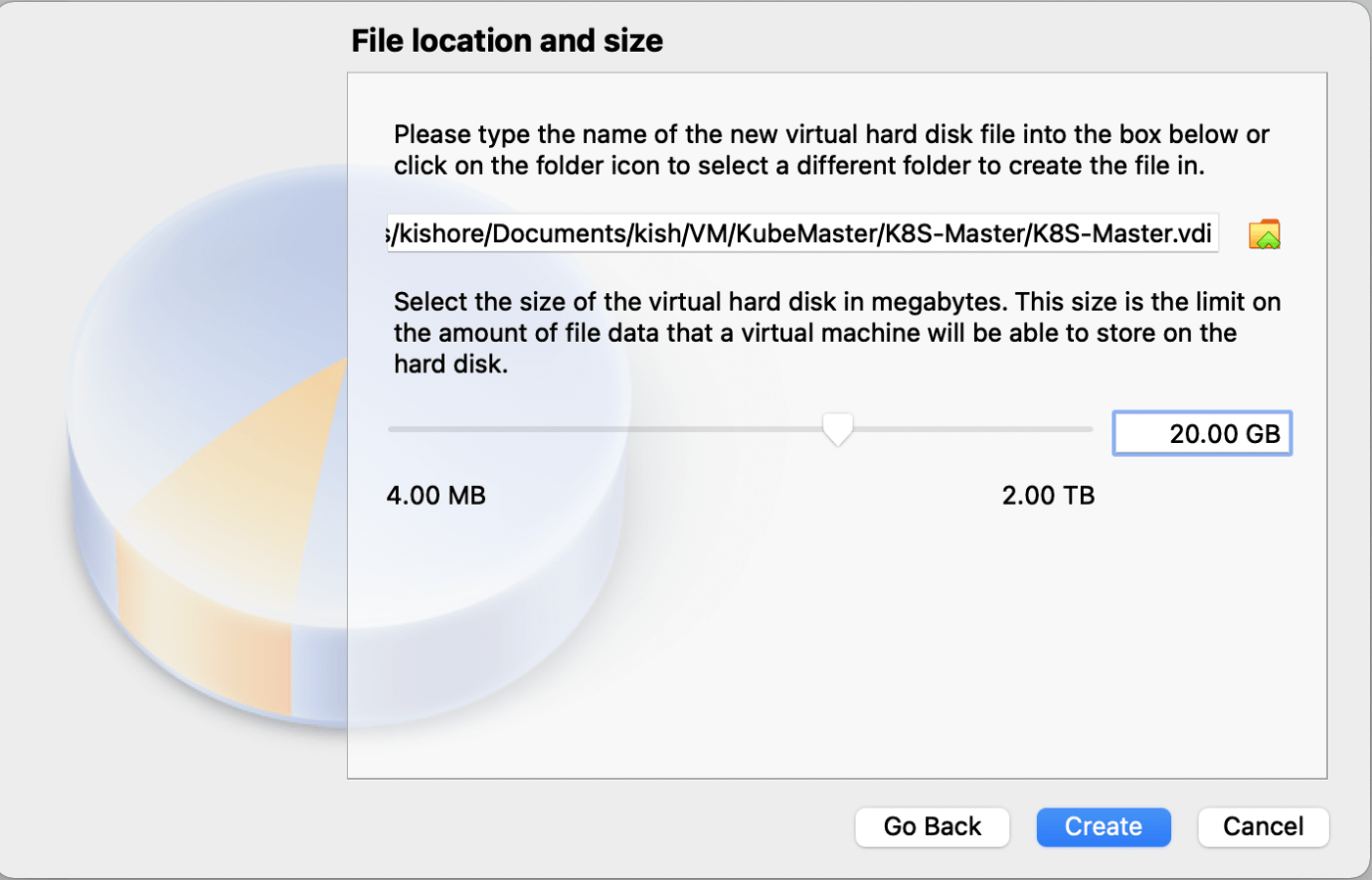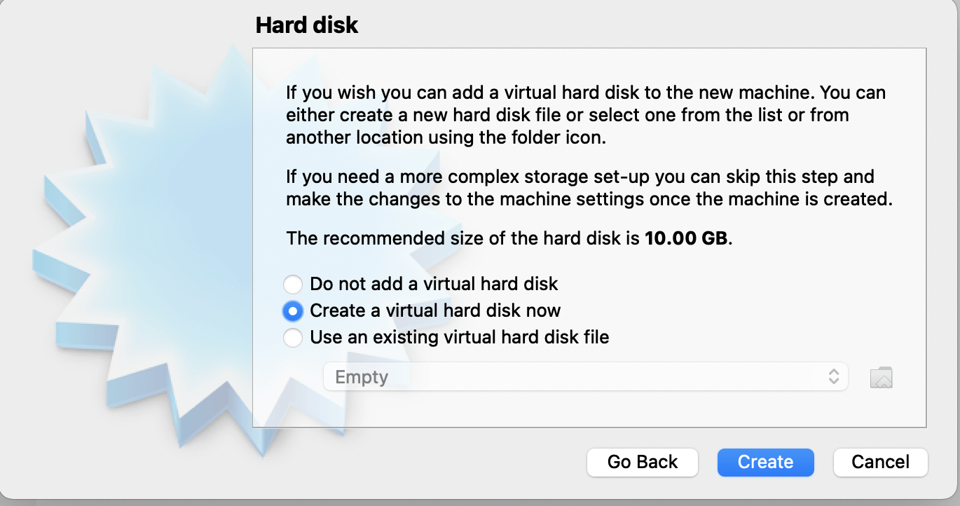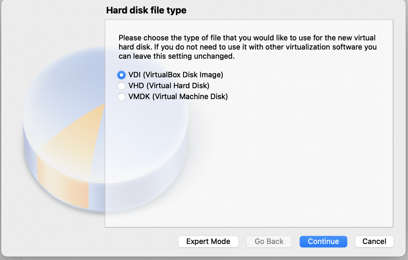 - Define the Hard Disk configuration, create a Virtual HDD>VDI