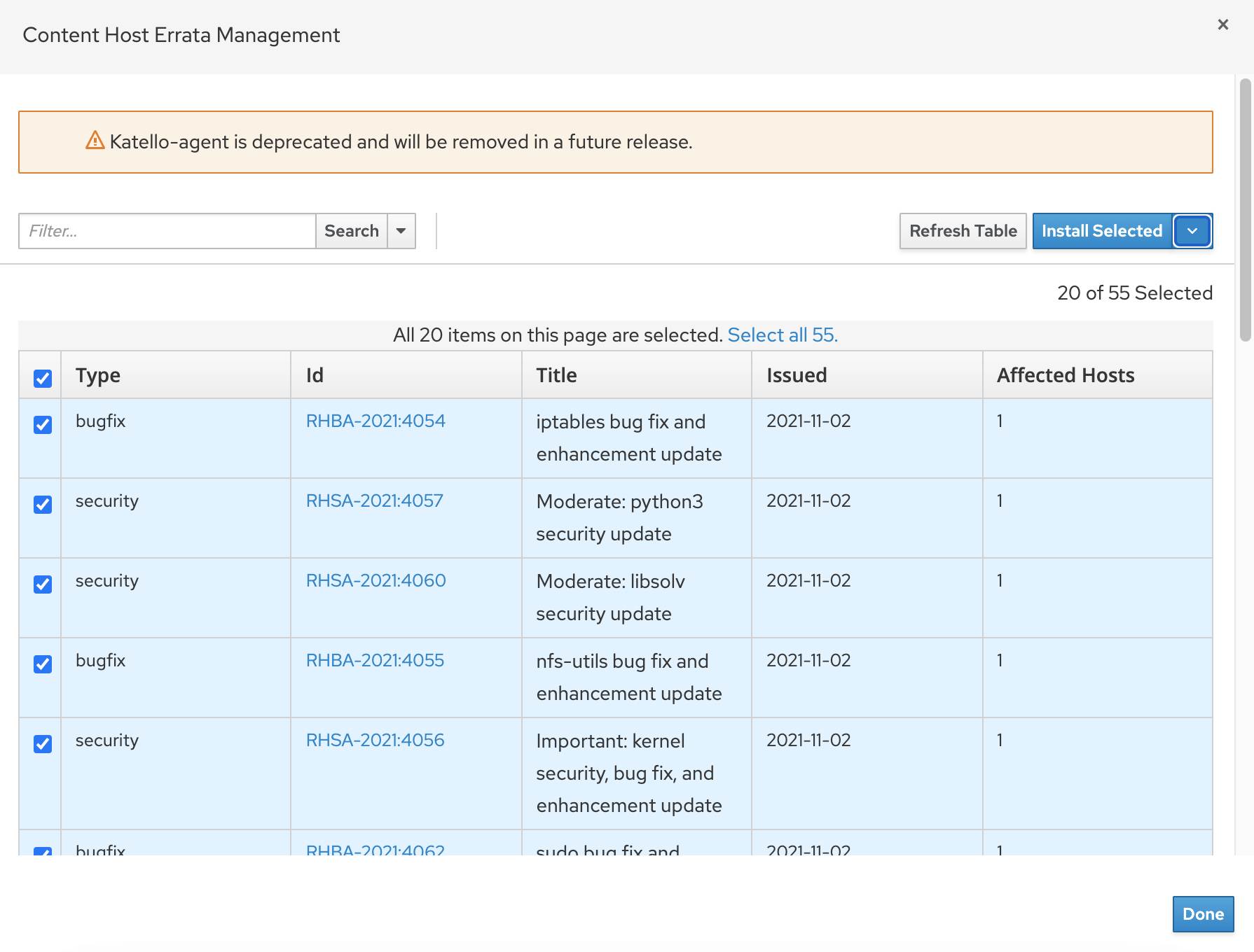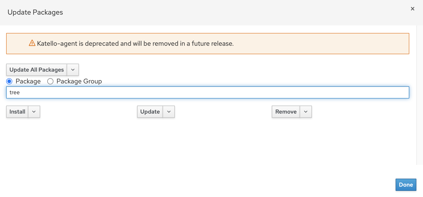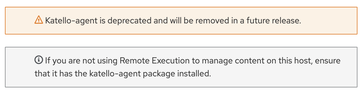 Using Red Hat Satellite is a great way to manage your RHEL servers and contents including updating, patching or installing software packages. A new method for remote content management was introduced with Satellite 6.2 which is called Remote Execution . (katello-agent is deprecated and you will see message like below).