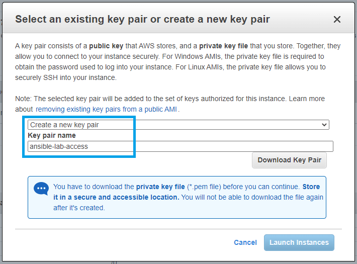 Download Key Pair and save it to a safe location; you will need this later to connect to the instance once launched.