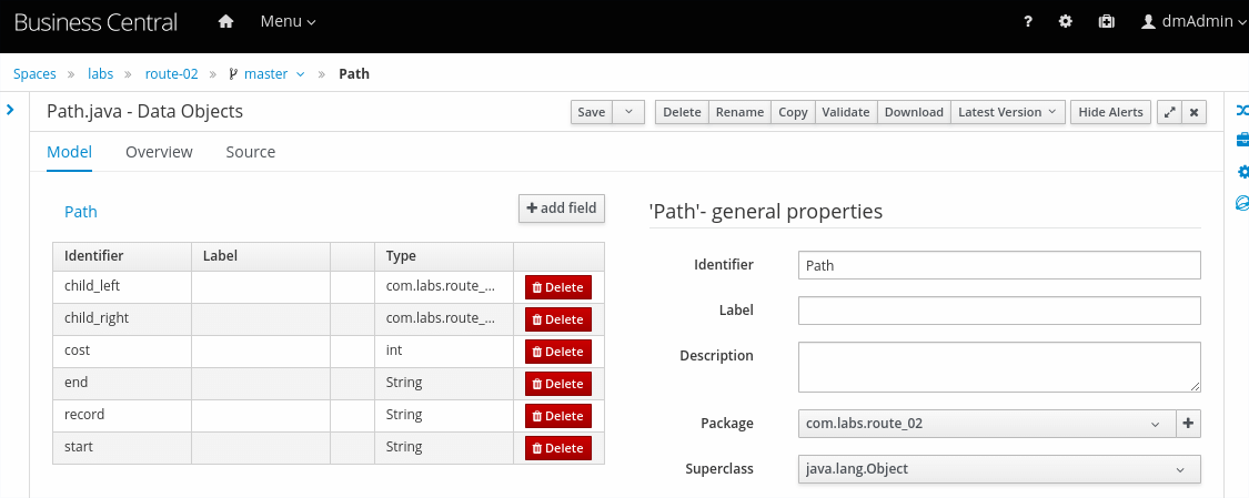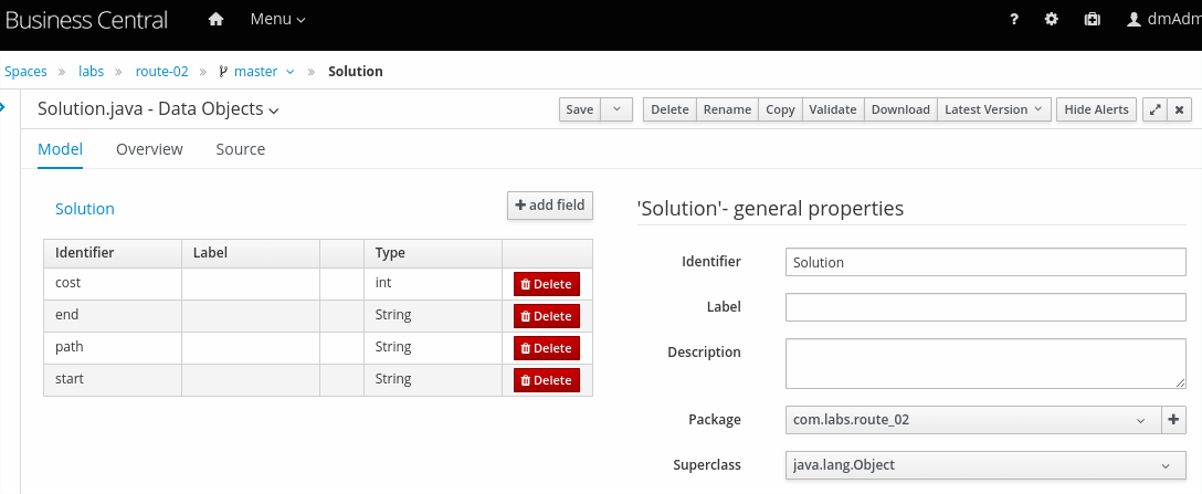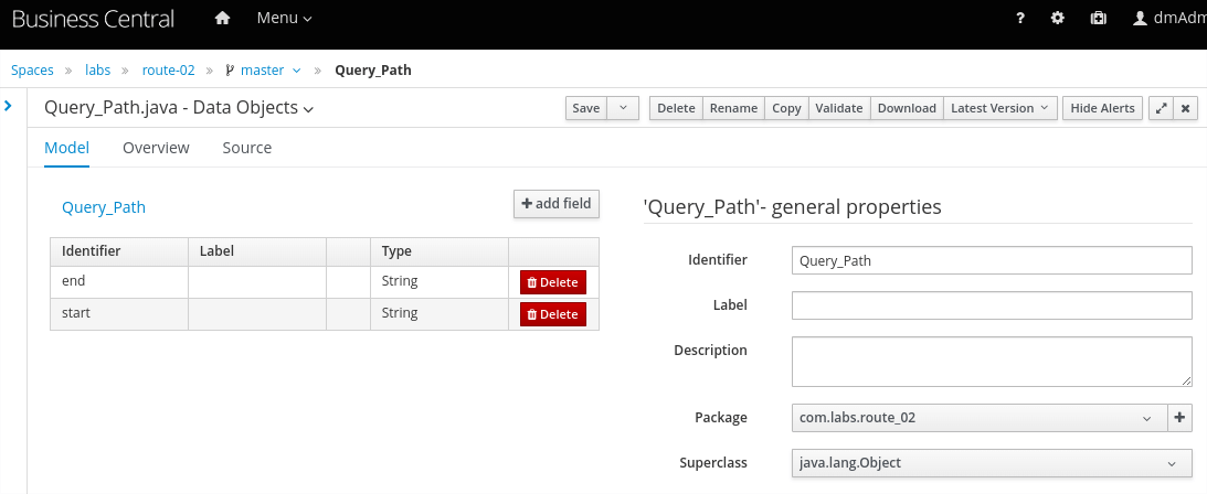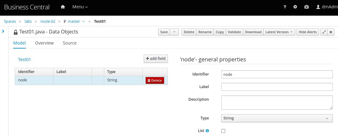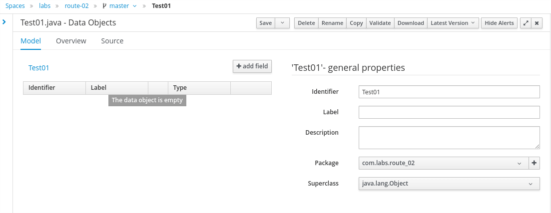 - In the data object designer, click add field to add a field to the object with the attributes Name, Label , and Type . Required attributes are marked with an asterisk (*).