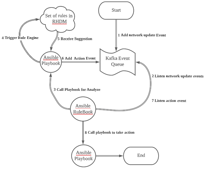 We use a rule base to find the new routing path with the lowest cost. RHDM gives the path from J to k. Kafka event is the communication channel for all parties, RHDM, Ansible, and possible monitoring or network devices.