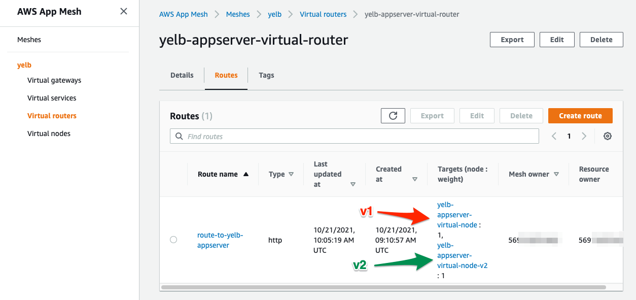 - Lastly, let’s change the Virtual Route to route all (100%) traffic to the newest version ( v2 ) of yelb-appserver :