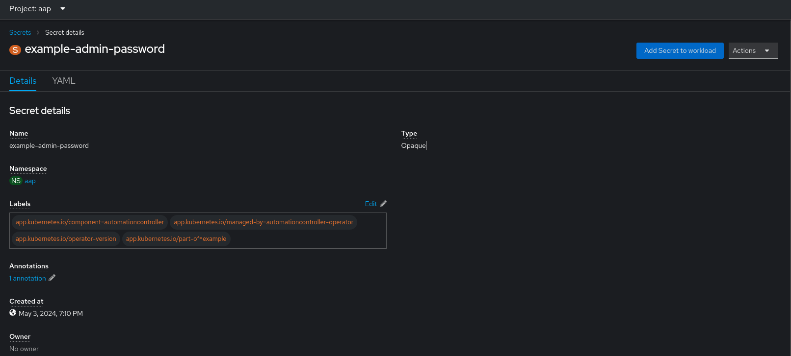 Please note, that the secret name will be the name of your automation controller deployment. Eg: if the automation controller deployment name is example , then the secret name will be example-admin-password by default. You can also create a secret upfront and pass it to the AAP operator while creating a new controller deployment.