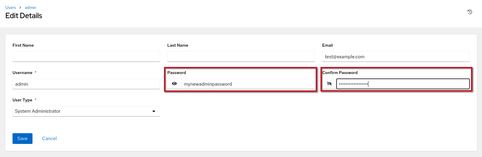 - Change Password: - In the Edit User Details section, you’ll see fields labelled “Password” and “Confirm Password.”