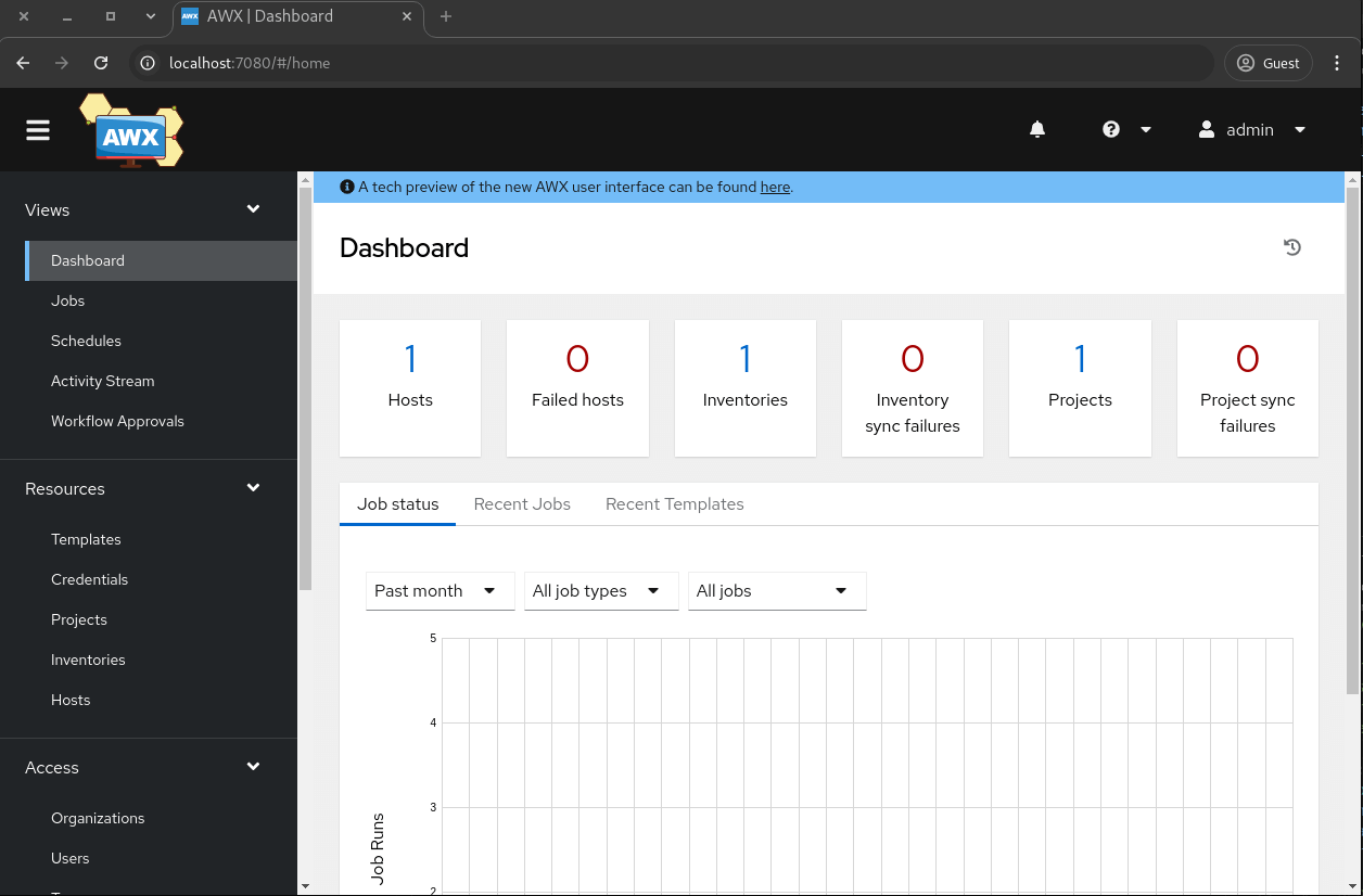Now you can access Ansible AWX WEBUI at localhost:7080 .
