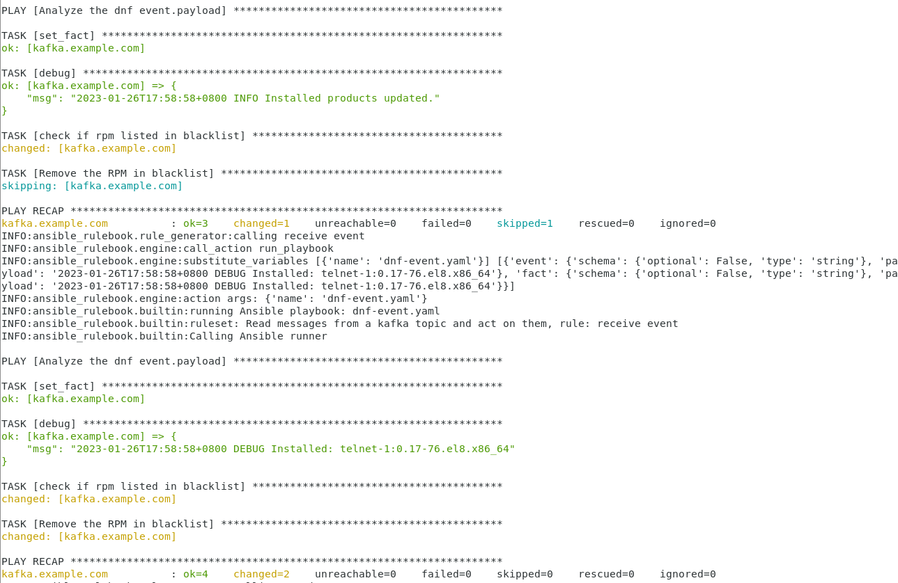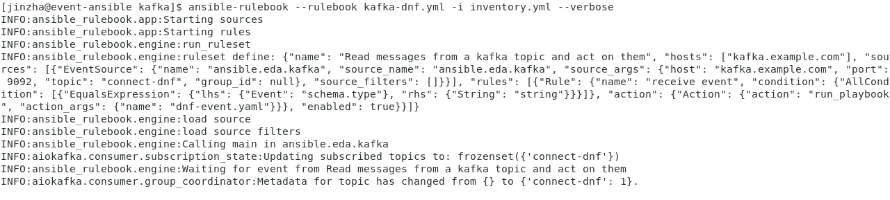 $ ansible-rulebook --rulebook kafka-dnf.yml -i inventory.yml --verbose