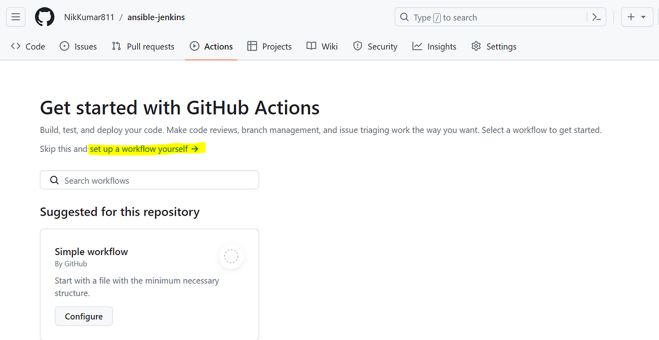 Click on “Set up a Workflow” to create a YAML file that defines your workflow.