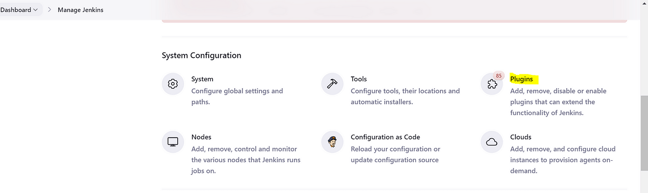 To install plugins in Jenkins click on “Manage Jenkins”, under system configuration click on “Plugins” to install the required plugins.
