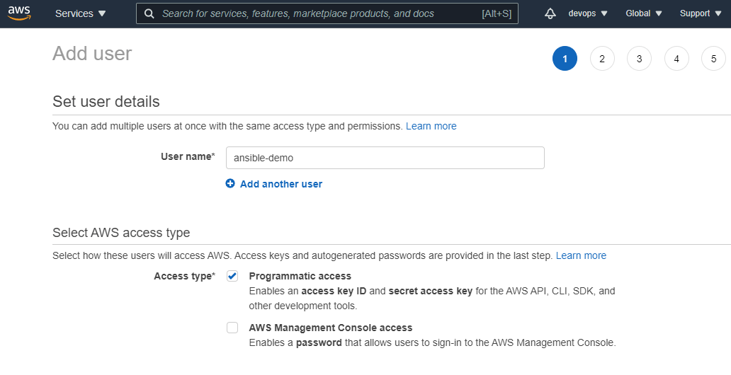 Goto AWS Console – > IAM -> Users -> Add User and select Programmatic access