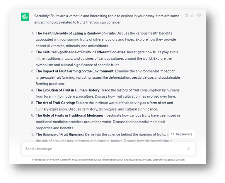 The leading platform being used for this purpose is ChatGPT. If you are having trouble finding the right topic for your essay, just go to the platform and enter your query. It will provide you with a wide range of topic ideas that you can use in your essay. Here’s how the tool does it: